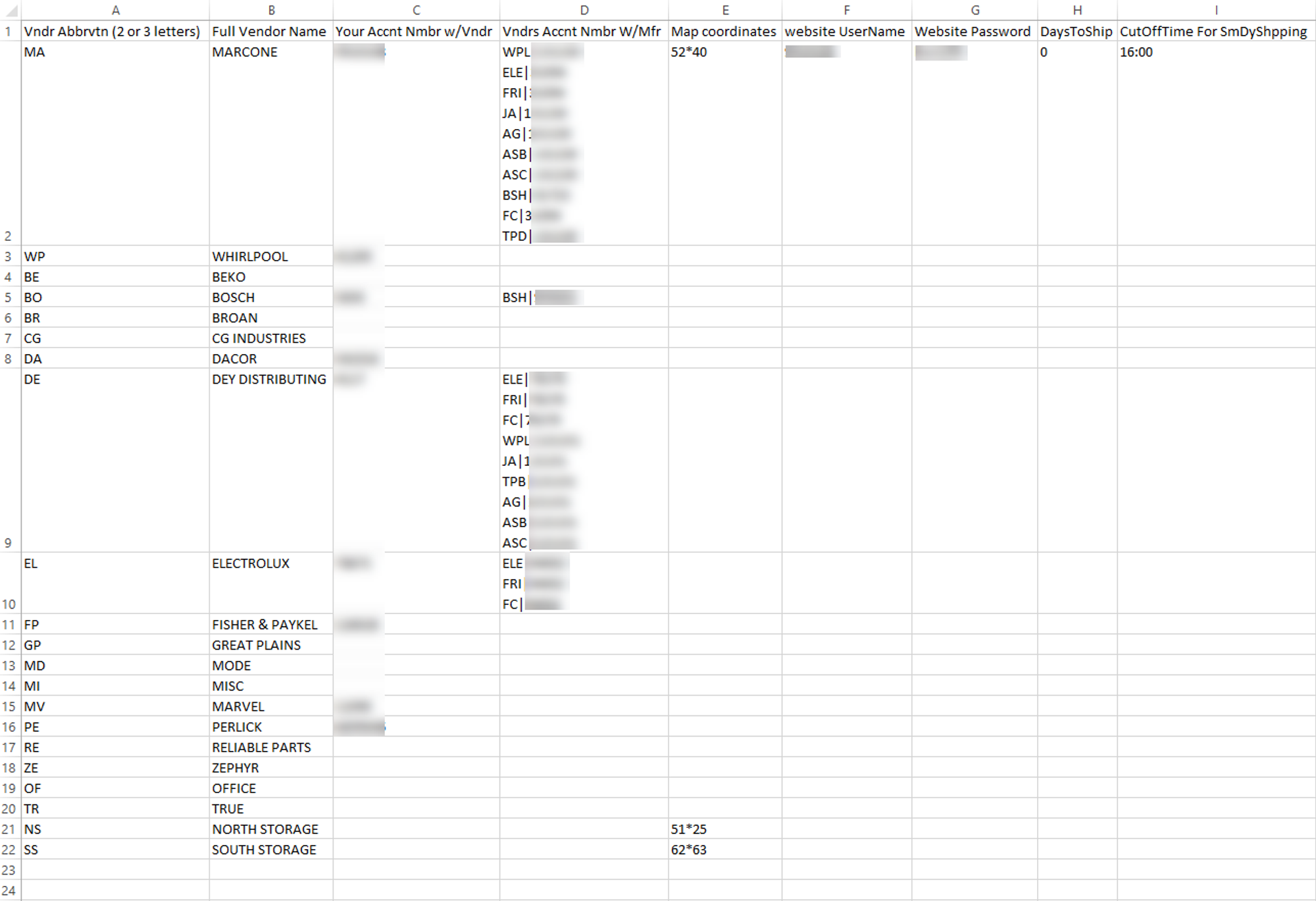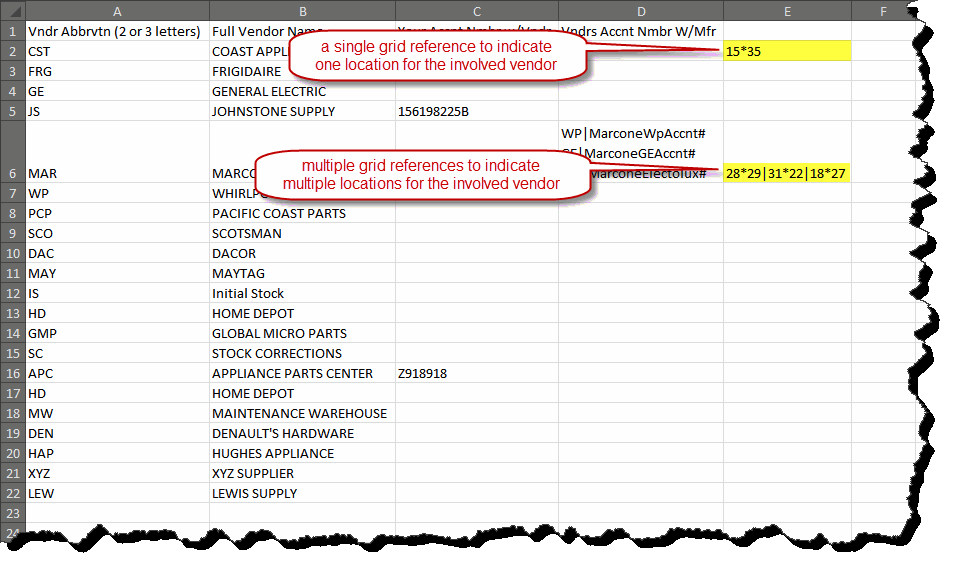 Suppose Marcone is a vendor for Whirlpool, GE, and Electrolux. In the cell for Marcone (in Column D under "Vndrs Accnt Nmbr w/Mfg"), type the QET abbreviation for Whirlpool, the bar symbol ("|"), and Marcone's distributor account number with Whirlpool. Press Alt-Enter to create a new line. Repeat for GE and Electrolux. Your cell will look similar to Cell D-6.