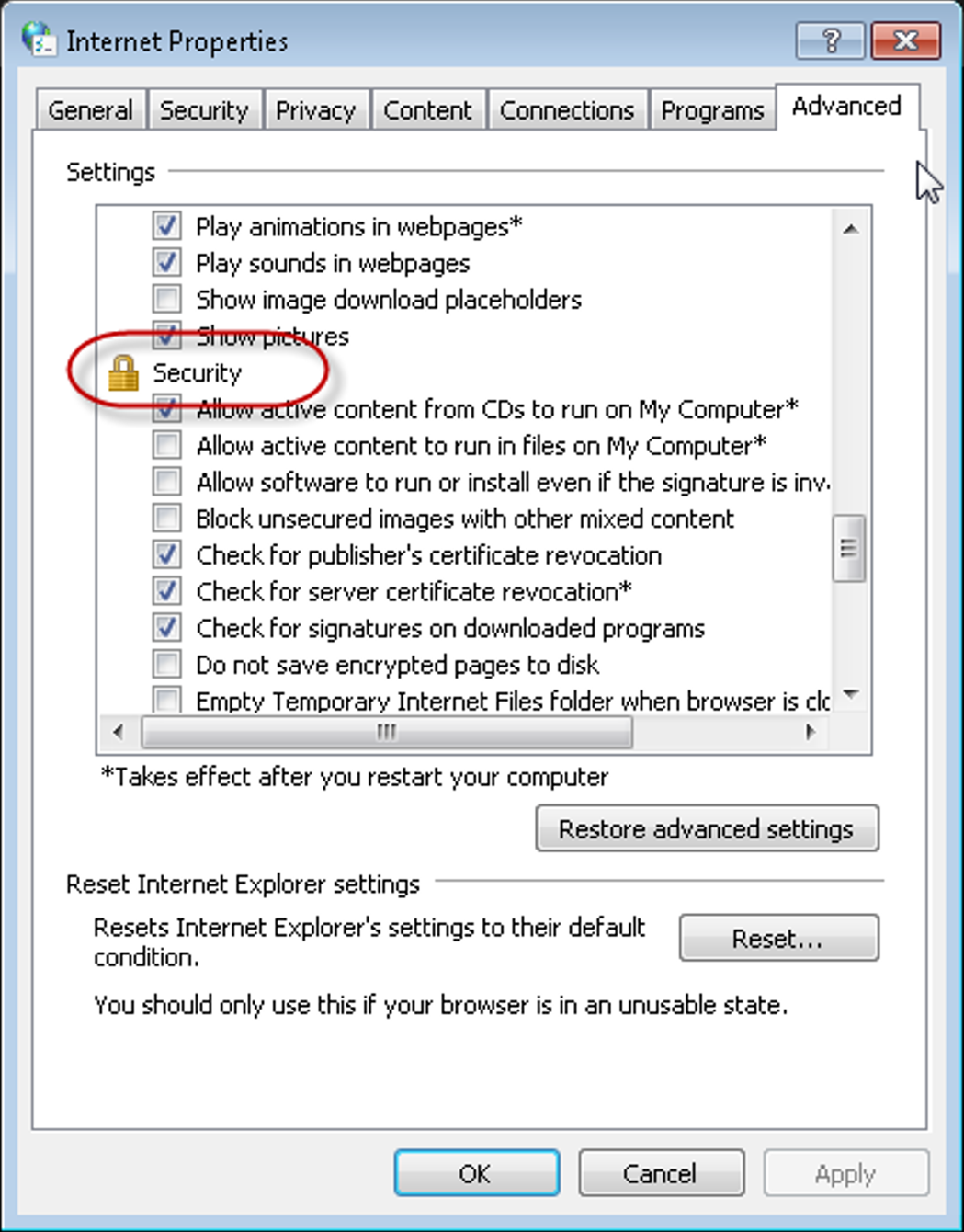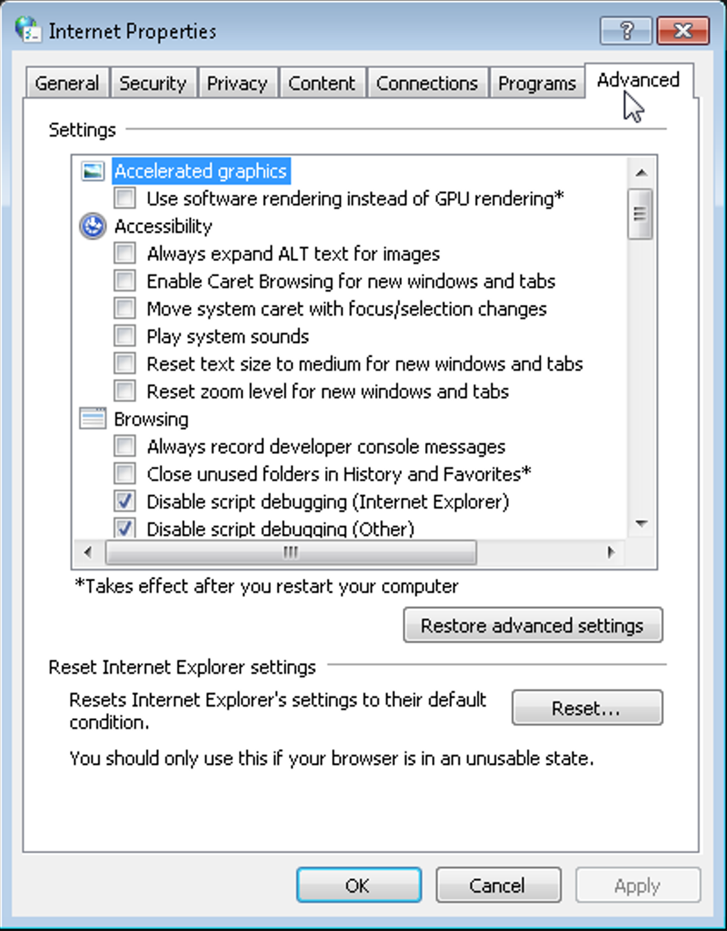 In the Internet Properties window which then appears, select the Advanced tab: