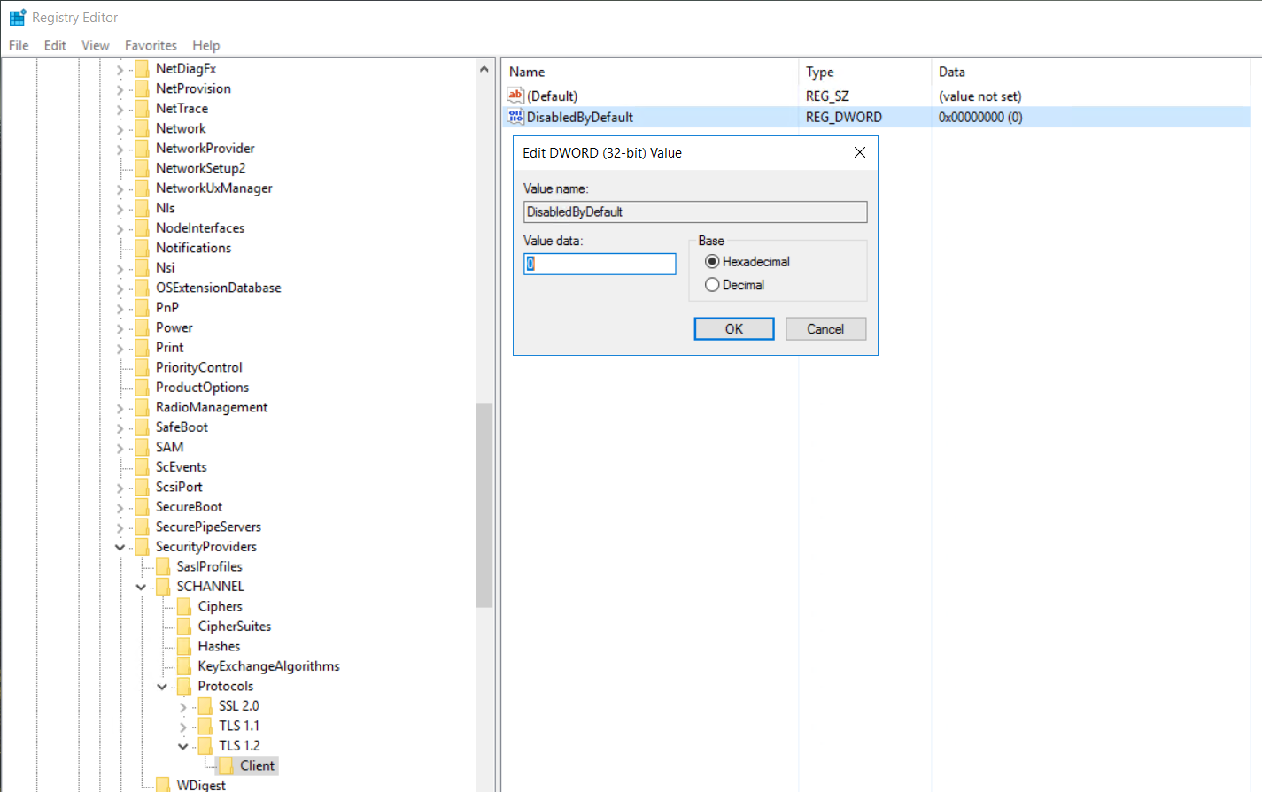 Registry location: HKEY_LOCAL_MACHINE\SYSTEM\CurrentControlSet\Control\SecurityProviders\SCHANNEL\Protocols\TLS 1.2\Client
