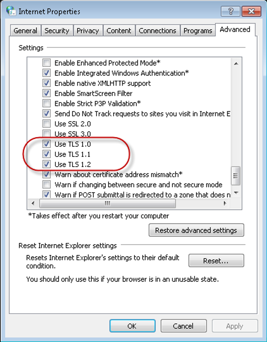 scroll further in that section to where you see check boxes for the three different versions of TLS: