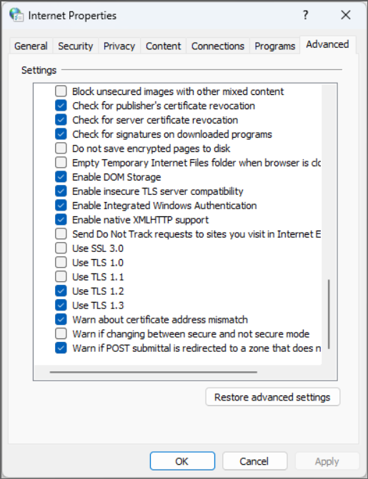 Some clients have found it necessary to uncheck the TLS 1.0 and TLS 1.1 to achieve resolution.