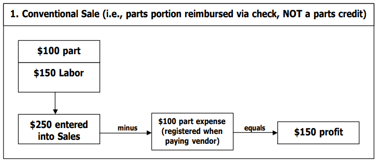 This means we should record transactions in the first illustration (normal payment scenario), not the second illustration (common warranty scenario). Doing this ensures that ServiceDesk can accurately track all aspects of each job, including parts credits.