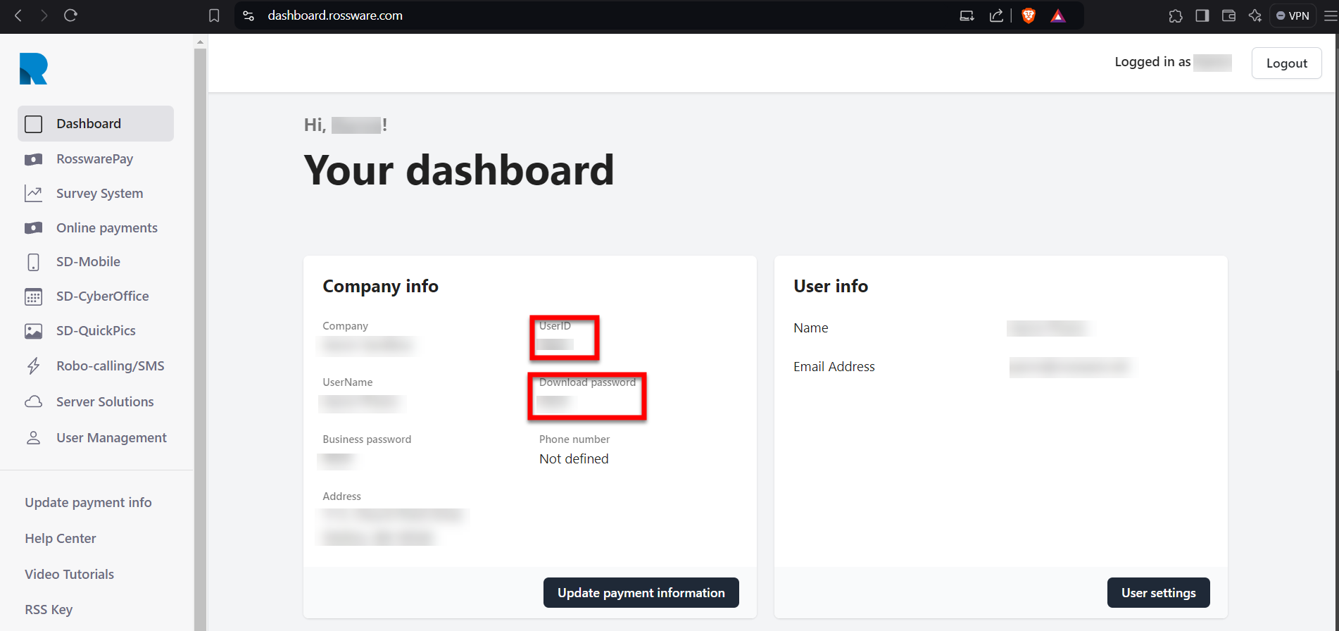 From the first page (dashboard) observe the UserID and download password.