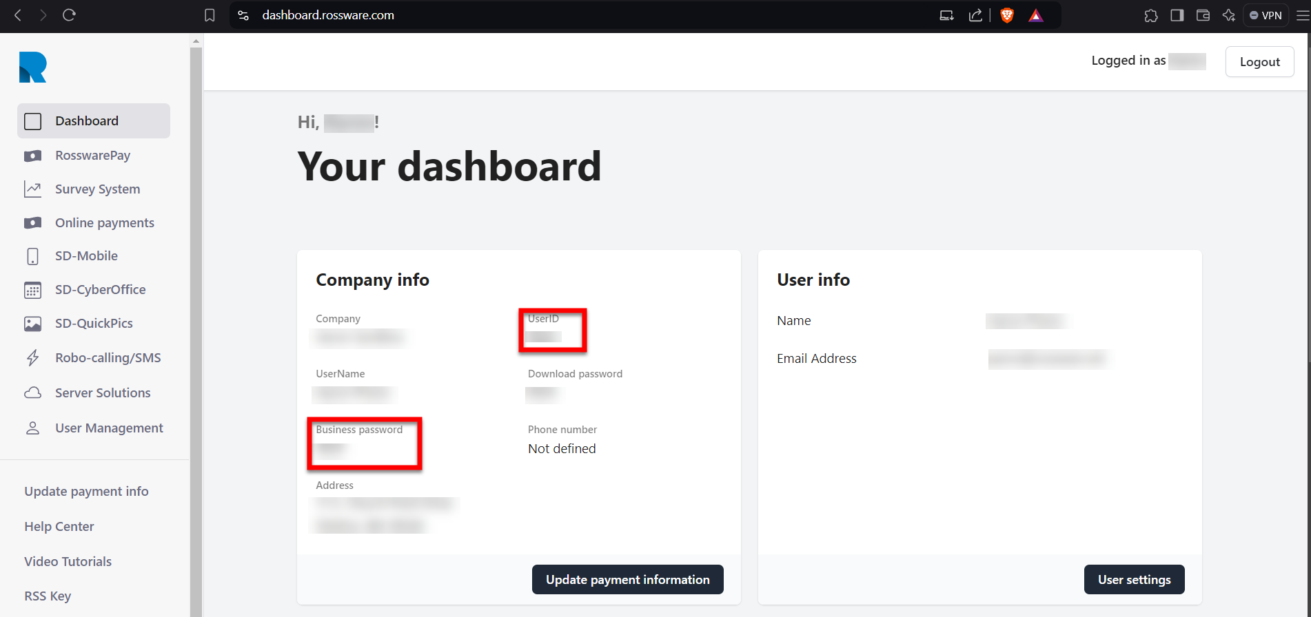 From the first page (dashboard) observe the UserID and business password.