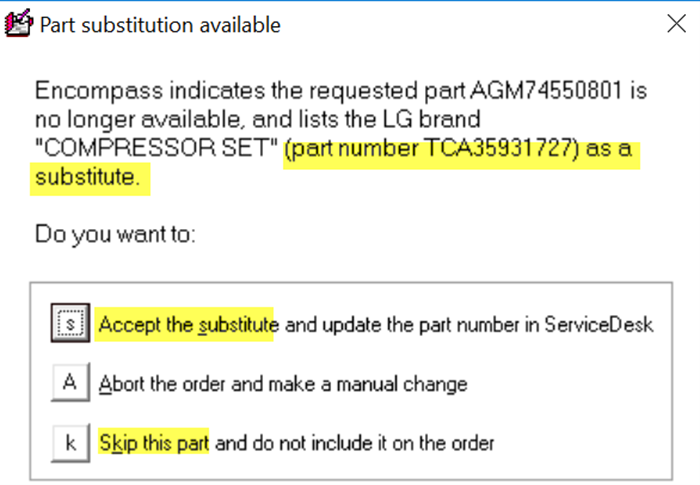 When Encompass reports that a requested part has a substitution, you will be presented with a message alerting you to the substitution. If you choose to order the recommended substitution, ServiceDesk will update the part request with the substituted part number. Alternatively, you can choose to abort the entire order until you have made your own edits/corrections to the part request or you may skip the part entirely and continue on with the remainder of the order. If you skip the part, the system will retain the original part request information so you can pursue purchasing the part through a different source.