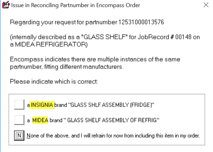 For example, you can see here that Encompass is offering a glass shelf for a Midea refrigerator from Midea or from Insignia. ServiceDesk will submit to Encompass the part you specify.
