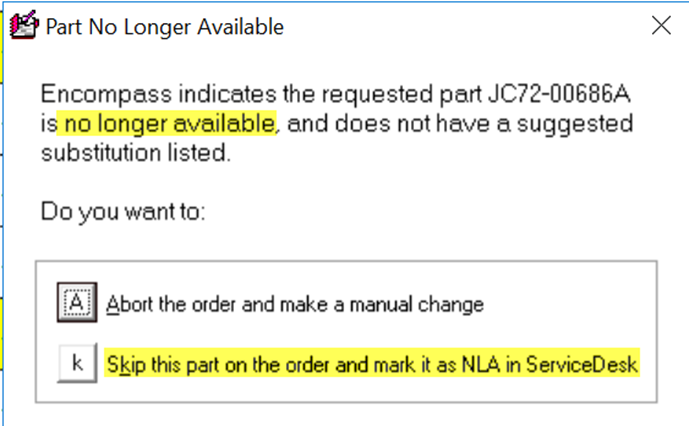 When a part is no longer available and has no recommended substitution, you will be presented with the option to abort your entire order process, or you can skip the part and ServiceDesk will mark the part request as NLA. This will allow you to then pursue other options for acquiring the part.