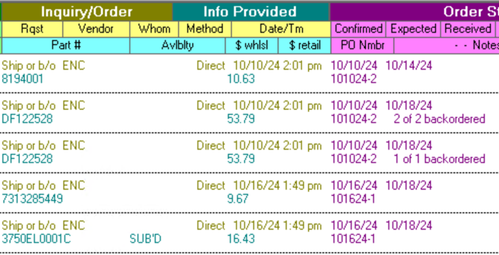 After the Encompass processing window closes, you will be able to see the part(s) updated in the parts process screen (F8) with the order date, the estimated delivery date, an indication if the parts were placed in a backorder state, an indication if the parts are substituted, and pricing details.