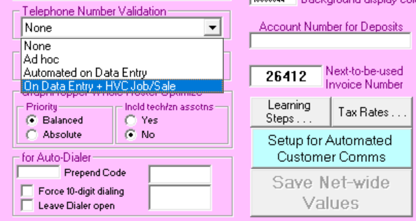 Currently, if you have enabled telephone number validation, ServiceDesk will either validate a phone number after the user has typed the number into a callsheet (Automated on Data Entry method) or by the user initiating a validation request by CTRL + left click on the phone number (Ad hoc). The new option, On Data Entry + HVC Job/Sale, will automatically validate phone numbers included in dispatches received from the DispatchLink utilities and the Email Dispatch Receiver (EDR) during the job/sale process.