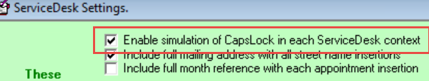 ServiceDesk has long employed the practice of activating the user’s CAPS lock in specific contexts where CAPS improve ease of reading or where best practices dictate the use of capital letters. However, in some instances, especially where ServiceDesk is being accessed by remote desktop, the physical CAPS lock behaved unexpectedly. To correct this, ServiceDesk will now simulate CAPS lock without affecting the physical setting on the user’s keyboard. If you have previously disabled the automated CAPS Lock setting in your user specific local settings, you will need to open the Settings form (CTRL + F1), check the box in the green section, and then save local values to reactivate this feature.