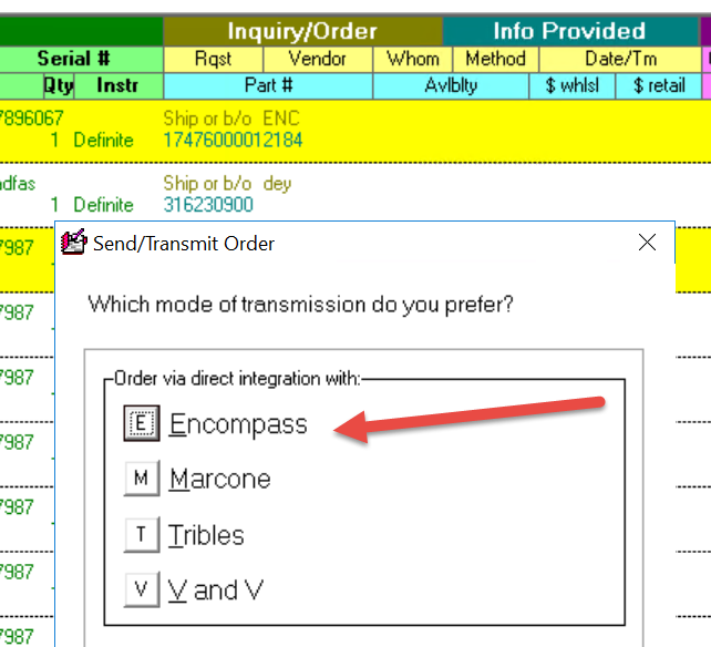 When selecting parts to order in the Special Order Parts Process screen (F8) under the selection “Items Needing Inquiry/Order”, you have the option to direct order parts through several vendors. We have worked directly with Encompass to provide the following improvements to the Encompass direct integration ordering process: