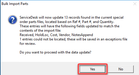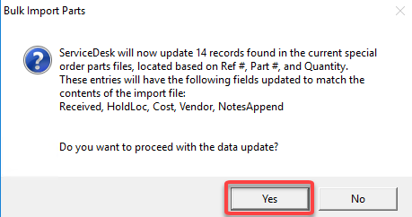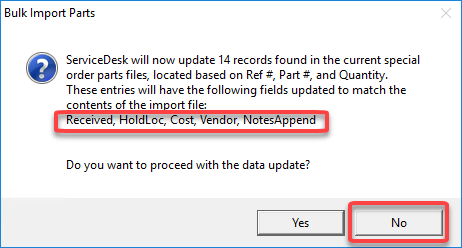 As this process updates part statuses, if the last part for any particular job is marked as received, ServiceDesk will pause the import process to ask the user how they would like to proceed with updating or changing the job status and notifying the customer.