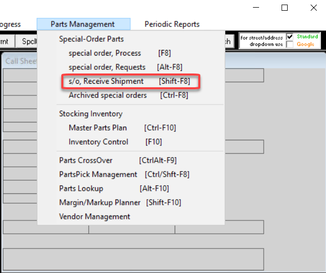 PONumber Optional field to match only on the PO Nmbr field in the Parts Process form (F8). (This will accept up to 10 characters. Updates or adds a PO number. Overwrites existing data.)