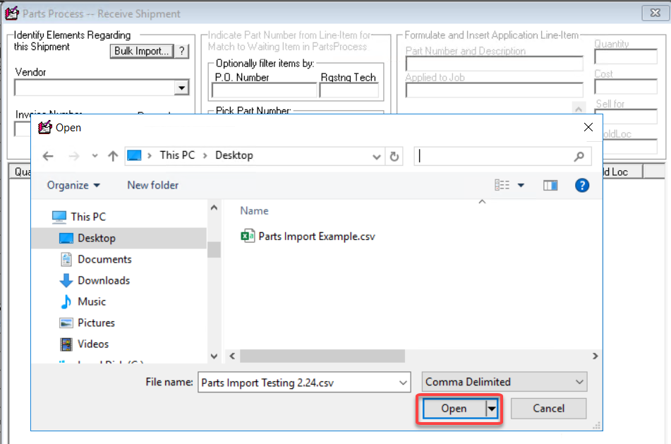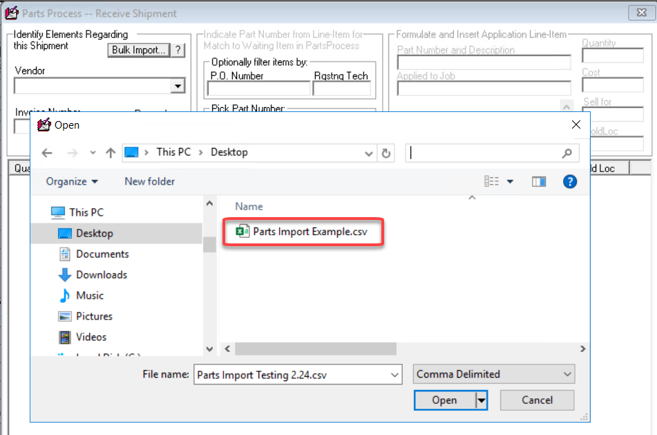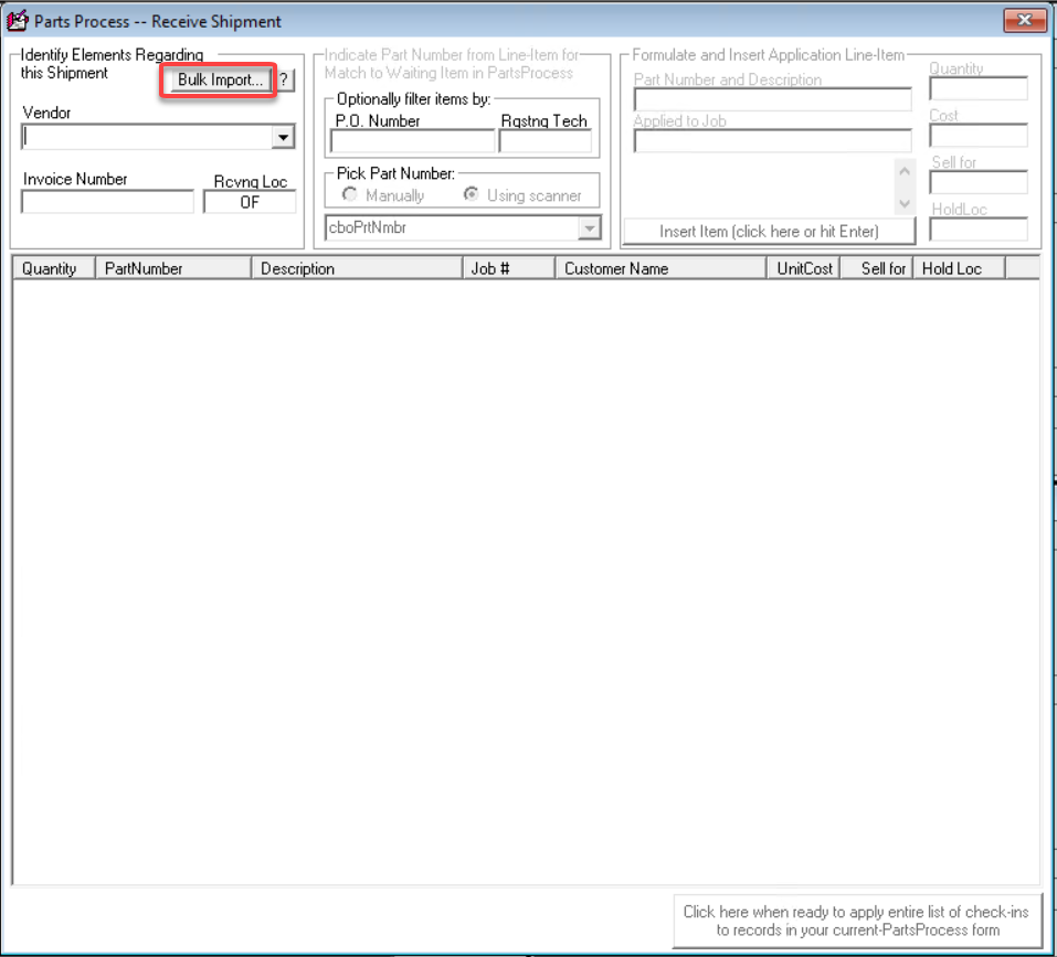 In the Parts Process -- Receive Shipment screen, click on 'Bulk Import.'