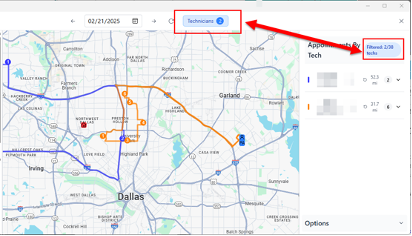 While viewing the map, the appointments within the view show on the left, and the techs will show on the right. As you zoom in to street level or out to a broader view, the listings will automatically adjust to reflect what appointments are found within your view.