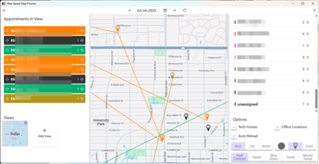 As part of this release, while you can drag and drop appointments in the Web-based Map Preview, this function does not yet look for reciprocal jobs, definite tech assignments, etc. Since the Web-based Map Preview opens in its own window, if your office utilizes these functions, it is recommended that you continue to perform routing and assignments in the standard DispatchMap. The changes made in ServiceDesk will be immediately updated in the Web-based Map Preview if you have Auto Reload activated.