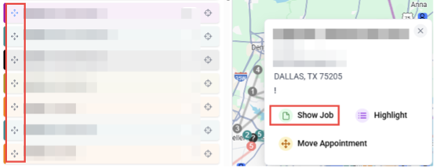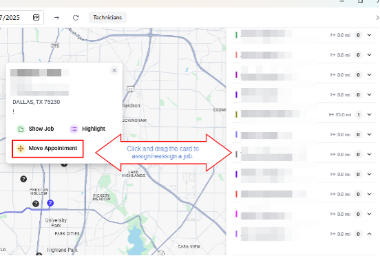 The Web-based Map Preview supports dragging and dropping appointments both within a tech’s route and from one tech to another within the tech lists. Additionally, you can also hover over a job in the map to open the job card and then drag and drop the job card into a tech’s route.