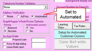 To take advantage of this new feature, users must subscribe to address verification. Address verification is activated in the Settings form (Control + F1). We recommend the automated option for optimum performance. This is because the Web-based Map Preview feature currently requires addresses to be geocoded. When using the ad hoc address validation, you may find appointments do not display properly until manually geocoded. If you would like tech home/starting locations to be indicated on the Web-based Map Preview, their addresses should be geocoded within the tech details form.