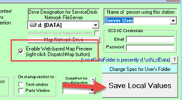 After updating to the current version of ServiceDesk users can navigate to the Settings form (Control + F1) and check the box in the green local values to activate this new feature. This is a user specific setting and will need to be activated on individual workstations. Once the feature is activated, the user can open the new Web-based Map Preview window by right-clicking on the DispatchMap menu button.