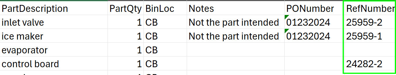To better accommodate using the parts pick management export as a starting point for creating a bulk part import file, we have added the RefNumber from the Parts Process (F8) to the Parts Pick Management Export. Parts included on the export that are from Inventory Control (F10) will have no reference in the export, distinguishing them from the Special Order Parts.