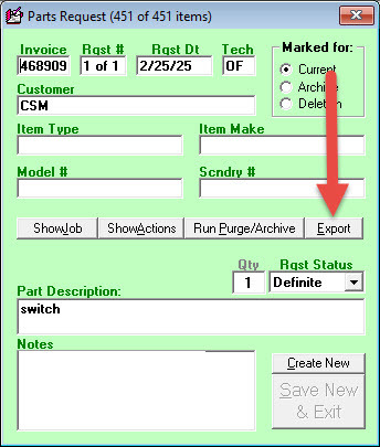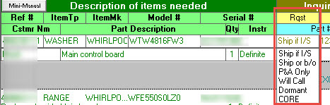 - New RequestType – Will update the Rqst field in the Parts Process form (F8). ServiceDesk is expecting one of the following entries: