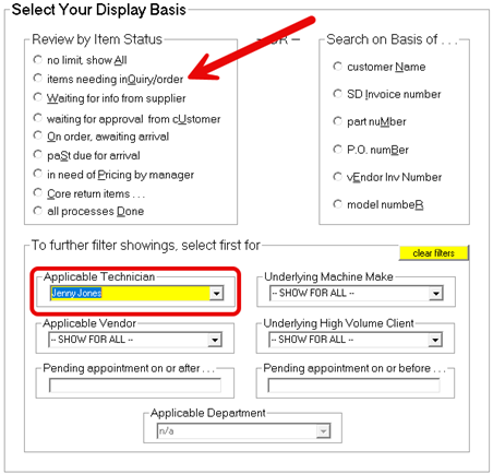 You may now utilize filtered ordering in the Special Order Parts screen. Previously, filtering would only display items that fit into specific categories, but to select items for ordering (control + right click), it was necessary to view the “items to be inquired/ordered” without applying filters. This version changes that approach. Users can now filter by technician, for example, to view only the parts ordered by the selected technician, and then select those items to include in an order for shipment to that technician. Another example would be to filter by the Vendor you have predesignated for the order or the High Volume Client in cases where parts must be ordered directly from the manufacturer.