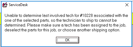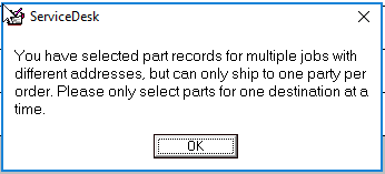 To send orders to customers where more than one job record is included, the service address in all the job records must be the same. Otherwise, you should only select parts for one job record at a time. ServiceDesk will provide a warning if the addresses of the selected jobs do not match. Since shippers like UPS require a phone number, the phone numbers in the job records must also match.
