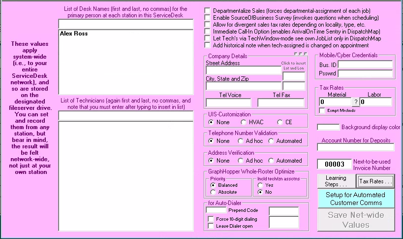 You could at this early point go ahead and insert such names to that list, and you could as well insert names to another box, just below, that’s intended to contain a list of all your technicians (or, of just the one, if you’re a one man operation). Or, if you want to zoom forward quickly now and get back to those tasks later, just proceed straight to clicking on the big button labeled Save Net-Wide Values.