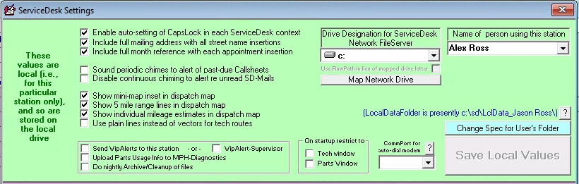 You'll notice there are two sections in this form. The first, shaded in green, settings local to the particular station on which you’re running. The second, shaded in purple, settings that affect all the ServiceDesk-equipped stations running in your network. Even if your system will consist of just one computer, these system-wide settings are also critical.