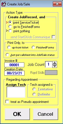 You’ll use this form to specify details about the job and appointment you’re creating. Specifically, this form proposes an invoice number and date, and invites you to specify the technician you intend to dispatch. For now, don’t worry about those details. Just hit your keyboard’s key to accept what's proposed (of if preferred, you could click on the form’s "OK" button).
