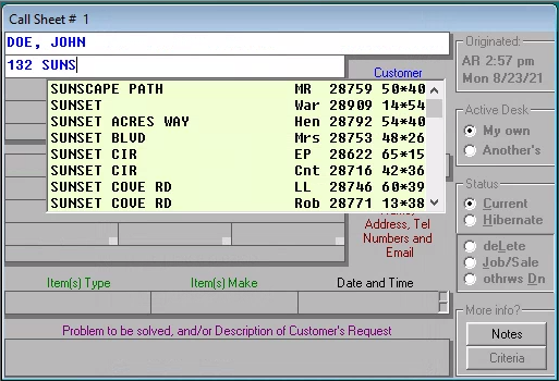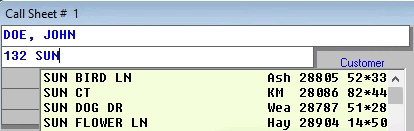 Now, suppose Mr. Doe tells you his address is 132 Sunset Drive (or some other street name that happens to exist in your area). Go ahead, begin typing that in the second line of your ServiceDesk Callsheet, but in this instance please watch as you’re typing in the word SUNSET.