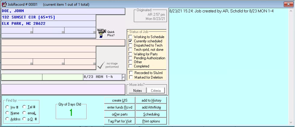 You should understand, it is this JobRecord that represents the job. It is this JobRecord from which the job will now be managed. It is this JobRecord that will maintain a running, historical narrative, detailing everything that happens on the job (notice in its History section to the right, there is already an entry detailing its own creation).