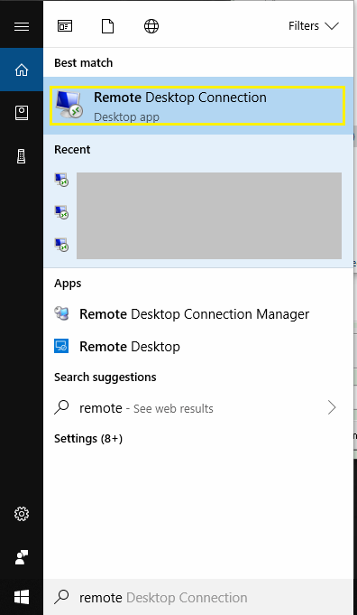 On the bottom-left corner of your local machine desktop, locate the search box and enter “Remote Desktop Connection”. The result should populate before you are done typing the entire phrase. Click the result.