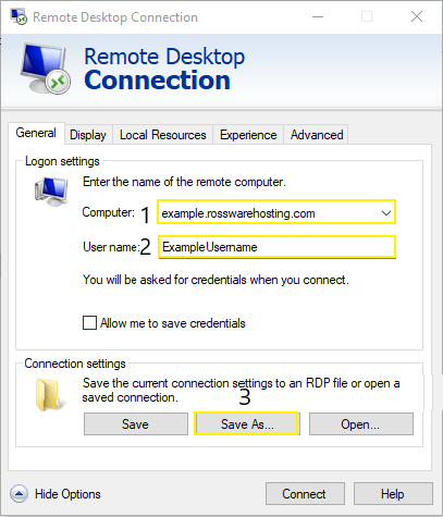 Enter the address you were provided in your initial migration email within the “Computer:” box. Enter your username. Your username should be the same as your current username. Click “Save As…” under “Connection Settings”