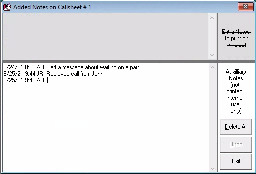 The second is labeled Auxilliary Notes, is rather different from the first. You’ll notice, this is the section you are automatically placed into upon loading the Notes window. And, ServiceDesk takes the liberty of beginning the entry, for you, with a short string of text indicating your own initials and the present date and time. Also note there is no intent for the contents of this section ever to print on your workorder/invoice. It’s purpose is solely for internal documentation—as specifically related to elements of communication, or attempted communication, between you and the customer as connected with the Callsheet.