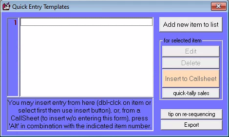 To create Quick-Entry templates, use what’s called the QuickEntries form. It’s accessed by pressing Alt-Q from any Callsheet, or via selection from the main menu.