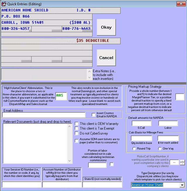 Moving on down in the form, you’ll see places for inserting information as applicable to a client for whom you do warranty service (such as your Servicer ID #, default labor amounts, and so on). These are used by ServiceDesk when later filling in a NARDA for you. Basically, when filling-in a NARDA ServiceDesk will look at the CustomerName as it exists in the underlying JobRecord, compare that text to that which exists in the equivalent field of each QuickEntry template, and when it finds a match figure to itself: “Aha, I can take the Servicer ID # from this Template (along with other appropriate items), and fill them items into appropriate places in the NARDA.”
