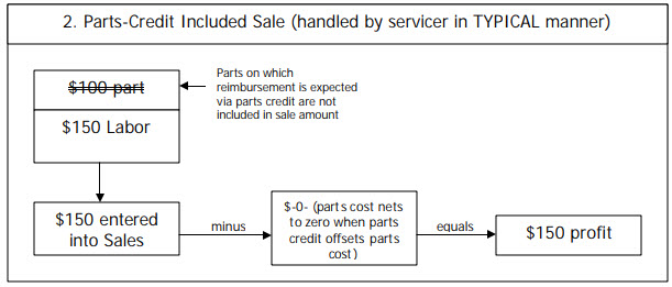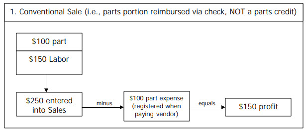 First (and by way of contrast from a parts-credit situation), let’s look at a normal pay scenario where your sale includes $150 in labor and $100 (at cost) for a part. You’re going to be paid for both via direct check in the amount of $250 from the manufacturer. You’re going to pay your vendor via your own direct check in the amount of $100. Thus: