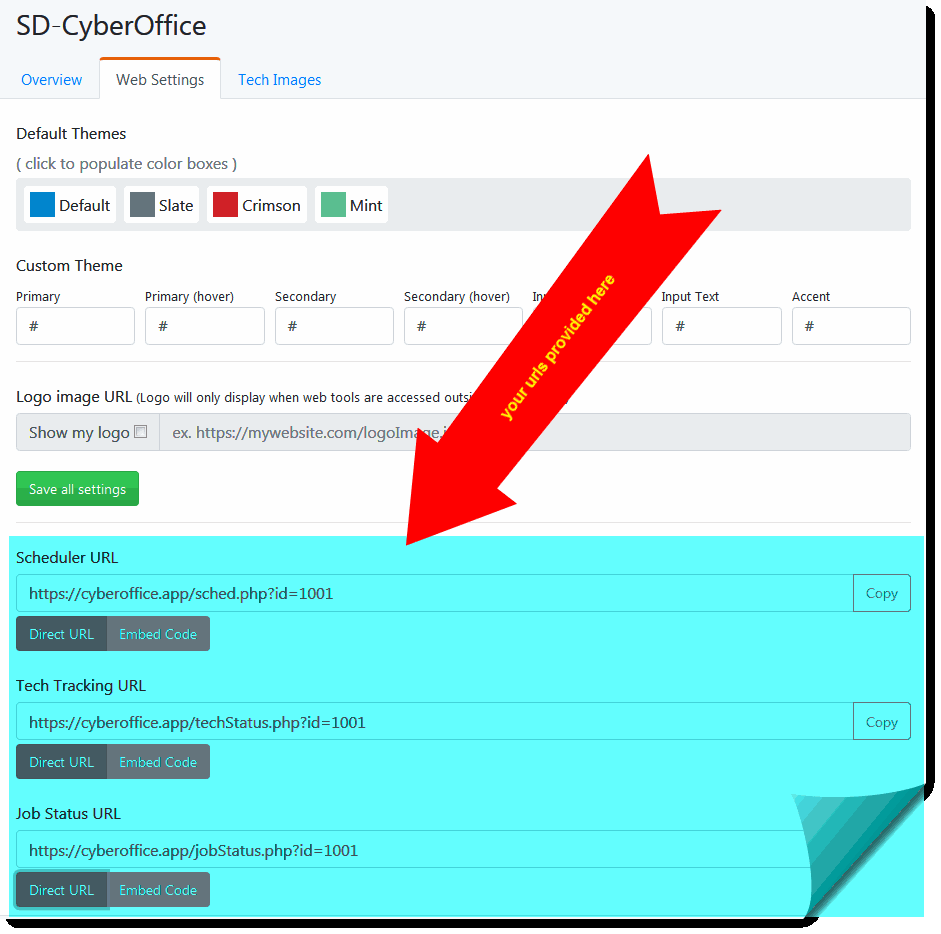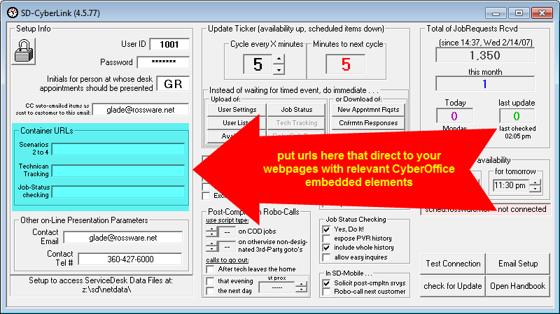 The general concept is, for scenarios 1 through 4, you’ll focus on the first box (as shown above) and assure you’ve selected to see “Embed Code.” The system creates such code as you need to insert into the HTML that defines your webpage of interest. Simply copy and paste into that page’s HTML. You’ll of course do similarly for the tech-tracking and job-status-checking contexts.