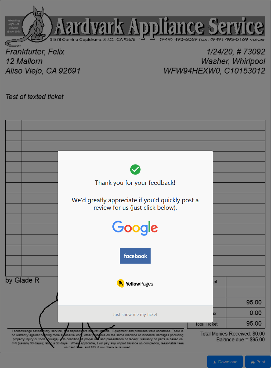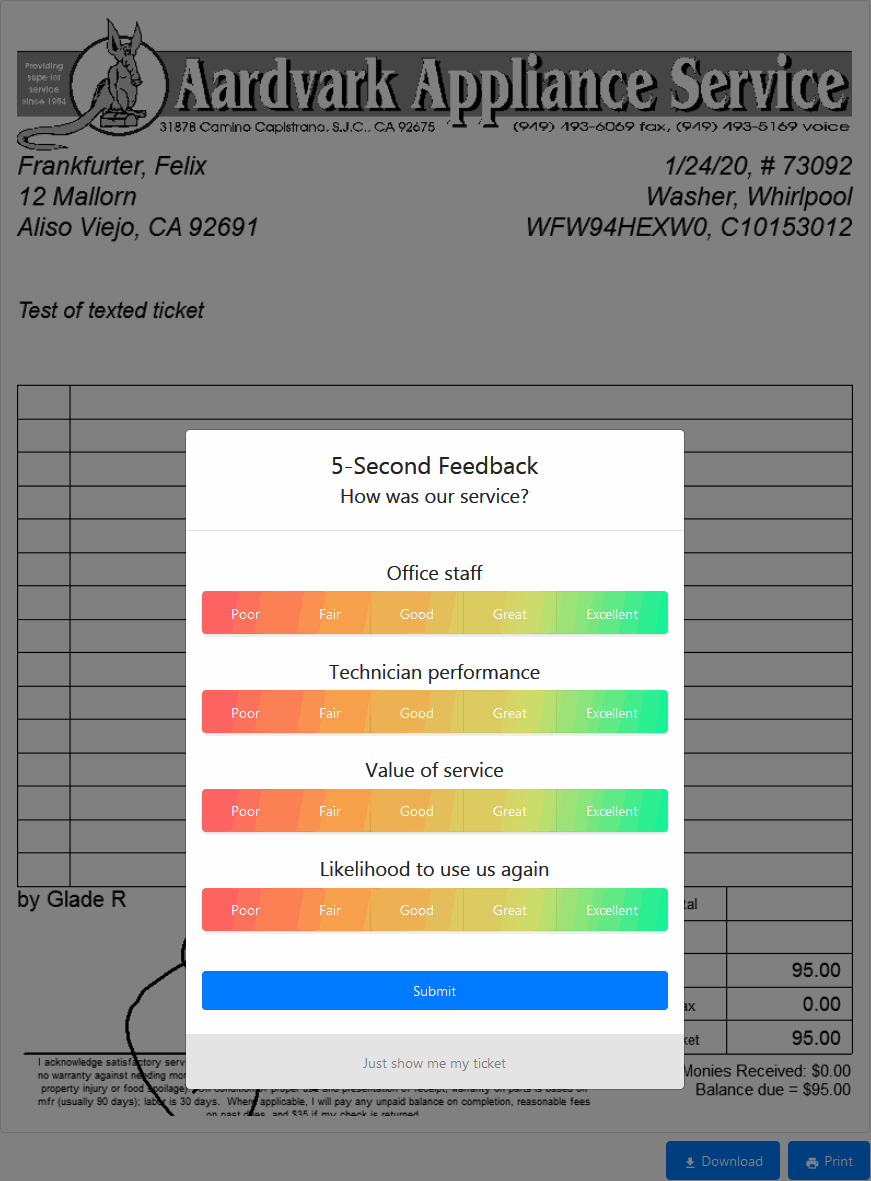 Assure that your techs are trained to provide e-tickets to customers on all jobs, including third-party-payer jobs (if you did not know, where this is the case SD-Mobile provides the ticket sans any dollar information; it's in a mode we call a "Work-Completion-Document"). This is important because it's via provision of a link to the online ticket viewer that the customer is presented with that all-important satisfaction query.