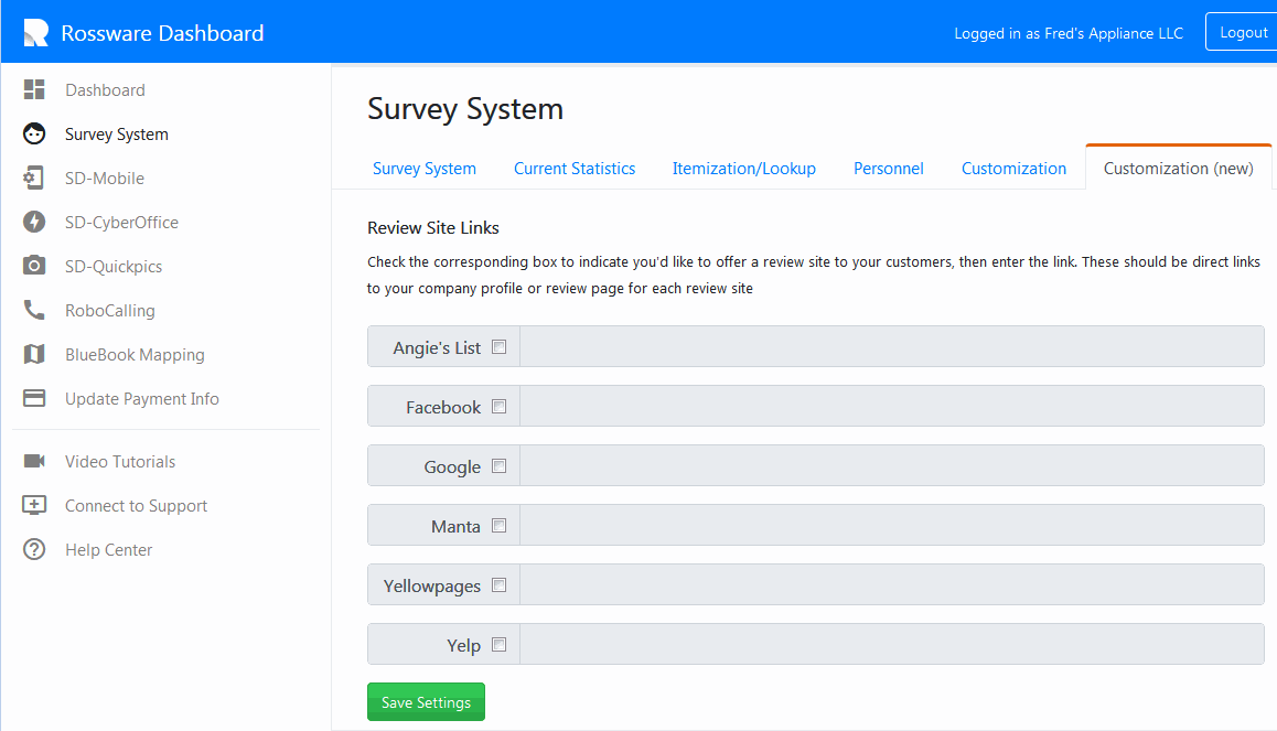 Use the provided interface at dashboard.rossware.com to inform the system of each site you want to invite happy customers to review on, and of what is needed URL. To get to that interface, pick "Survey System" from the menu at left in the interface, then "Customization_New" along the menu bar at top. The resulting interface will initially look like this: