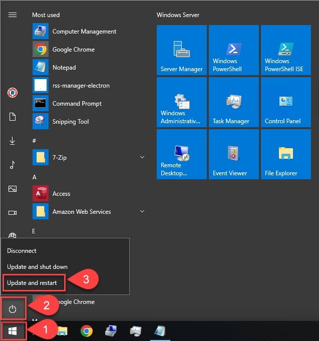 In the RSS Server, click on the Windows icon on the left of the taskbar. In the start menu, click the power icon, and select Restart or Update and restart.