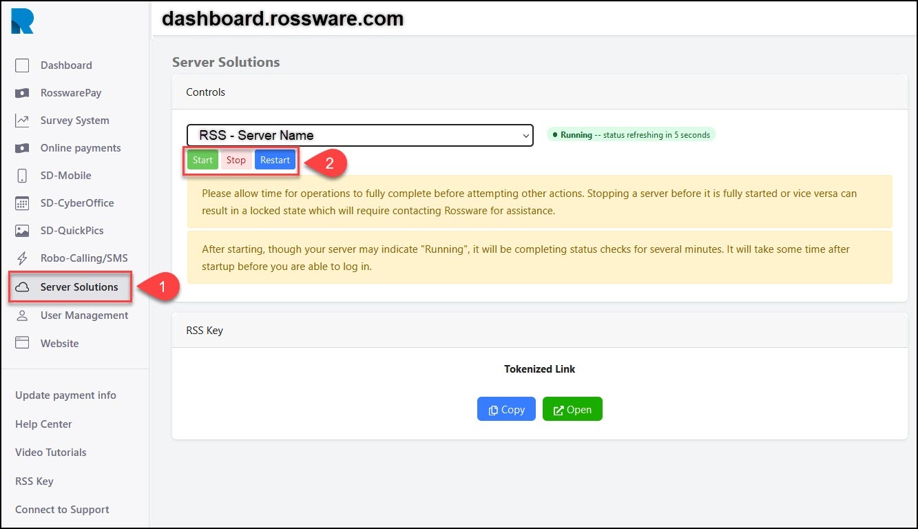 In the Rossware Dashboard, click on Server Solutions on the left. Then, click the blue Restart button at the top in the Server Solutions window.