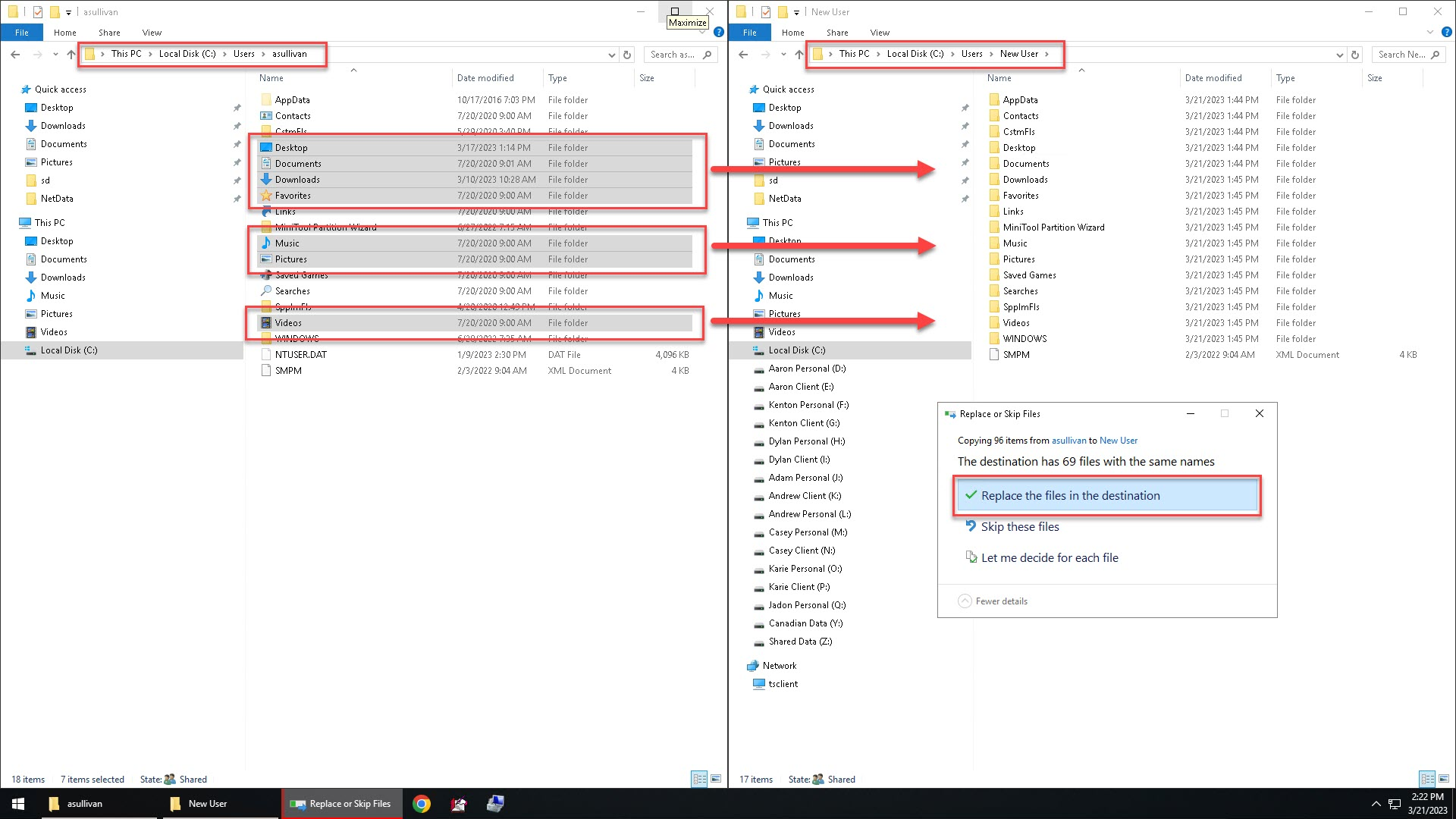 In some cases (especially if the account is a Standard User) you may need to copy and paste these folders using an Administrator account.