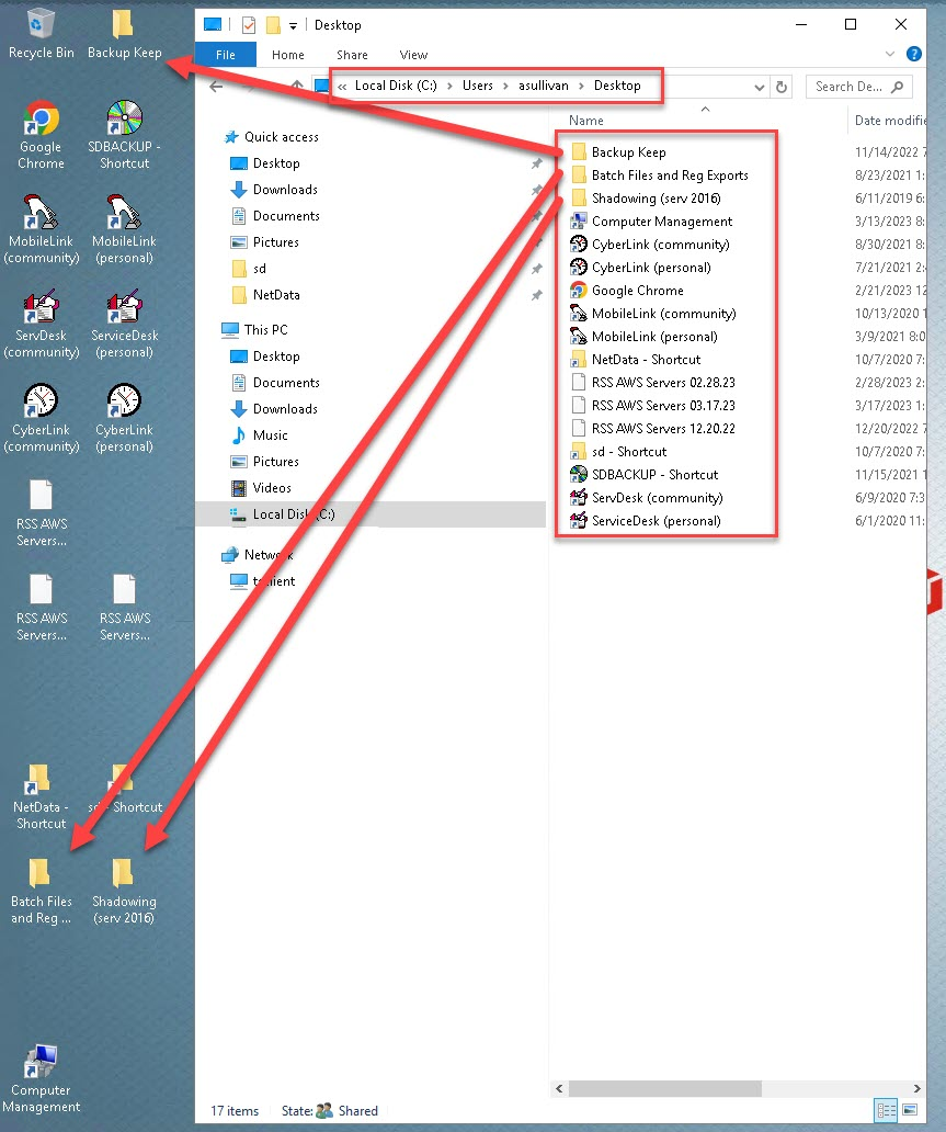 Compare what's on the Desktop and in the Desktop folder.