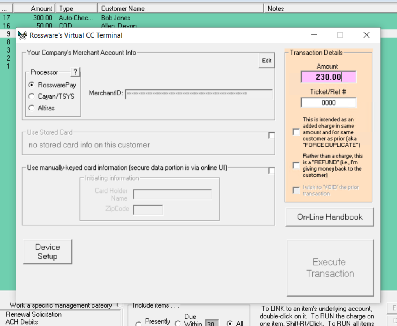 Once you have used one of the above two methods to initiate a charge, SD-RevenueBuilder will open the same Virtual Terminal you may be familiar with from ServiceDesk. See the Virtual Terminal Guide to set this up if you haven't already. The Virtual Terminal will be pre-filled with the information from your selected billing item. You can then charge the card by clicking Execute Transaction.