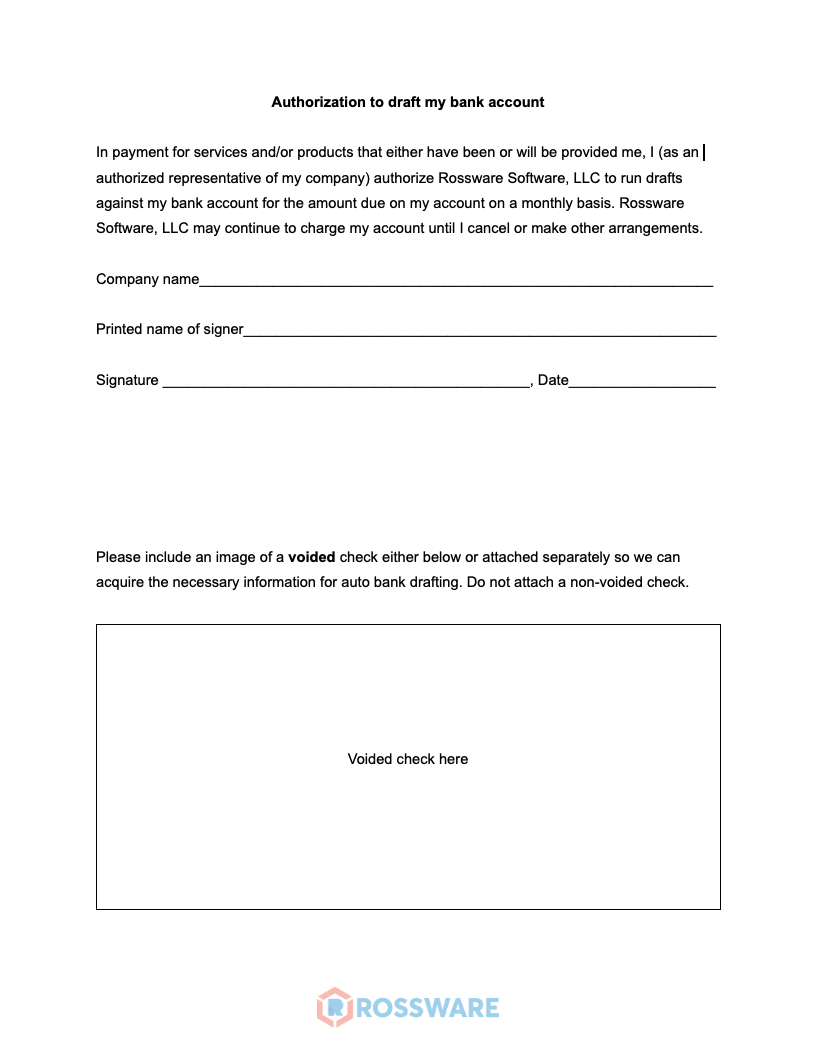 Of course, you don't want to use this method unless your customer has clearly authorized you to do so. At Rossware, when one of our clients wants to setup for this kind of payment method, we email them a simple form that looks like this: