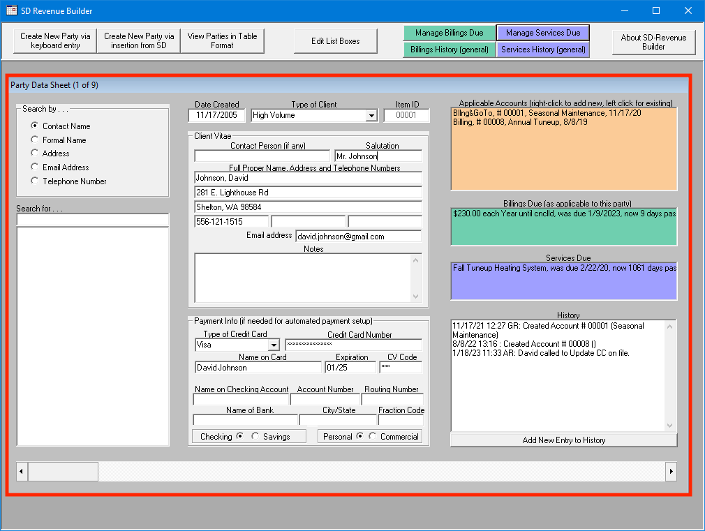 The primary page you'll see when you open SD-RevenueBuilder is the Party Data Sheet. You might notice it does not have an exit button; this is because it's always going to be visible here in the background. The party datasheet contains information about a particular party. We use the generic term party because you can have at least two different broad categories of parties: