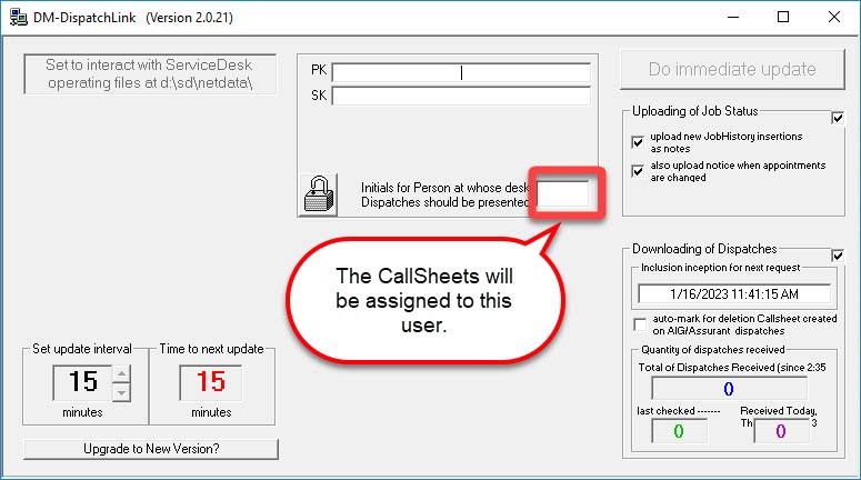 Provide the initials of the desk user who will receive the active CallSheets when new jobs are downloaded.
