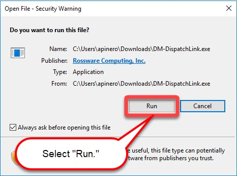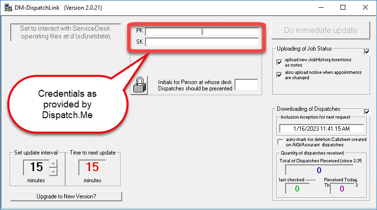 Please send an email request to support@dispatch.me to acquire these credentials. Explain that you are setting up to use Rossware's “Second-Generation Connector” utility (that is their expression for our current DM-DispatchLink utility), and you need a “Second-Generation Set of Connection Strings” that will allow it to connect to their system. Their support team should reply with the set of strings that you need.